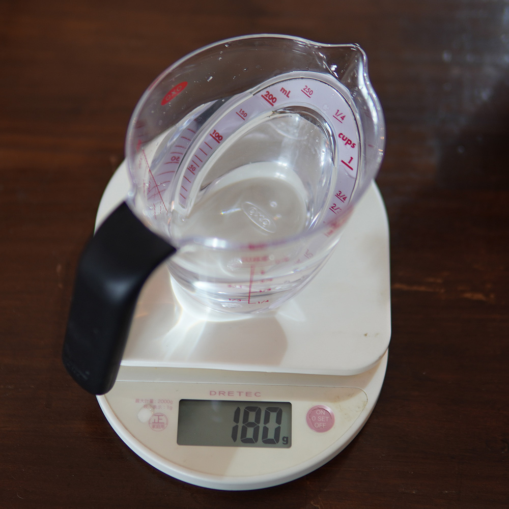 食パンミックスの裏面の説明には水200mlとなっていますが、20g分のバターを入れているので、水をその分減らして180ml測って入れます。